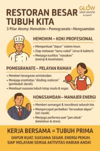 - Siang (12:00–14:00) → Setelah beraktivitas, Delima kaya polifenol membantu menetralisir radikal bebas dari stres fisik dan lingkungan.