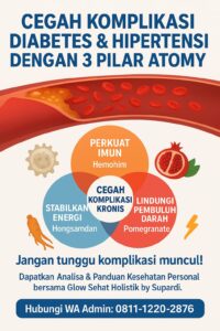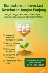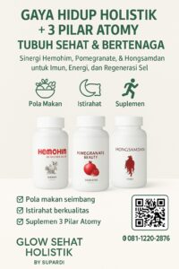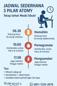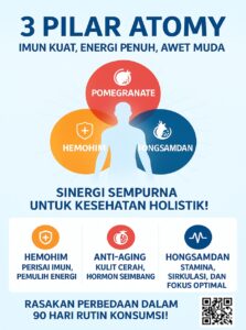Konsumsi Hemohim + Hongsamdan di pagi hari untuk mempersiapkan energi dan imun sebelum olahraga ringan. Setelah aktivitas, gunakan Pomegranate untuk membantu memulihkan sirkulasi darah dan mengurangi stres oksidatif. Dukungan olahraga ringan yang konsisten, pola makan bergizi, dan istirahat cukup akan memaksimalkan efek sinergis 3 Pilar Atomy pada kesehatan tubuh.